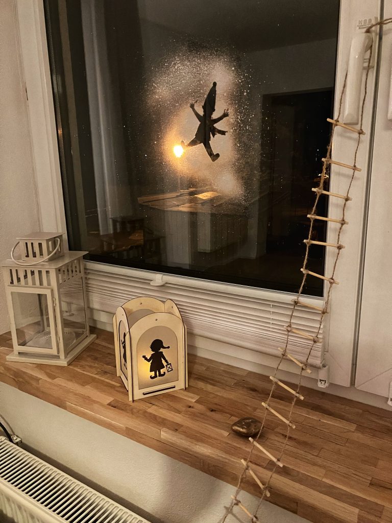 Nachdem fast den ganzen November über die Laterne brannte, die dem Wichtel den Weg zu uns zeigte war es nun endlich so weit – am Fenster hing wieder die kleine Leiter, die bis zum Boden führt und wie du siehst, hat Snorre wohl auch vergessen, das Licht der Laterne zu löschen. Die Silhouette ist noch ganz frisch, vielleicht ist er gerade erst verschwunden, als er die Kinder gehört hat?