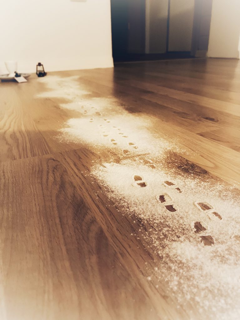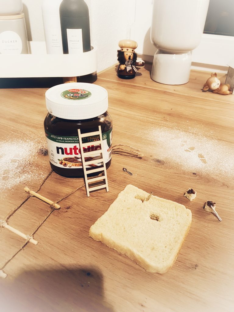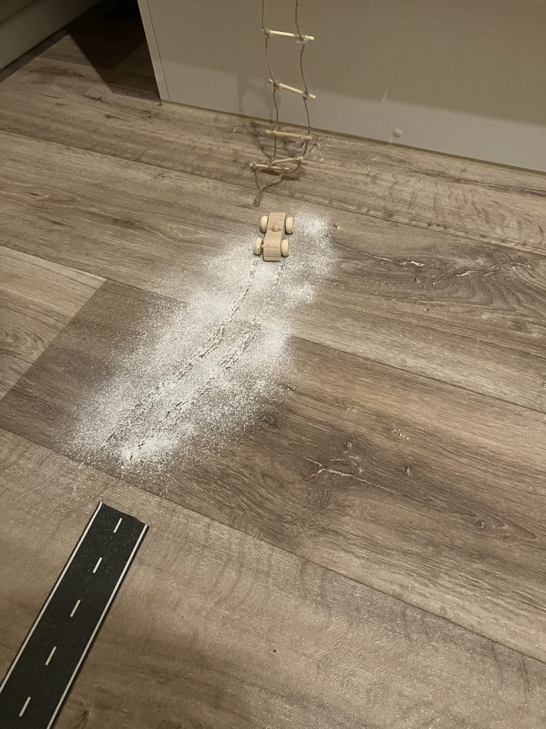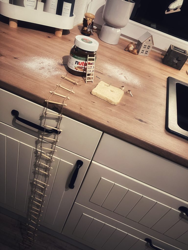 Snorre hat das noch einmal übernommen, aber nichts zu Essen gefunden … deshalb führte eine Straße direkt bis in die Küche, Mehlspuren inklusive. Auf der Arbeitsplatte fanden wir ein Stück Toast, winzige Bissspuren und zwei Löffel – dort war Snorre wohl erfolgreich auf Futtersuche.