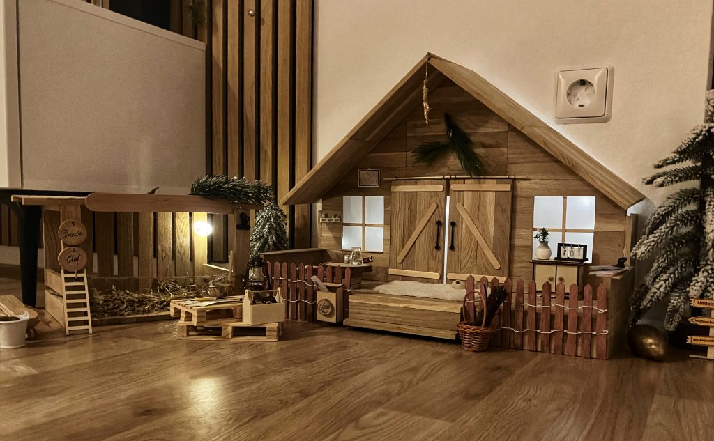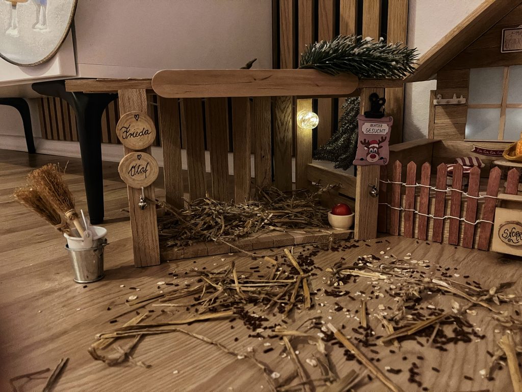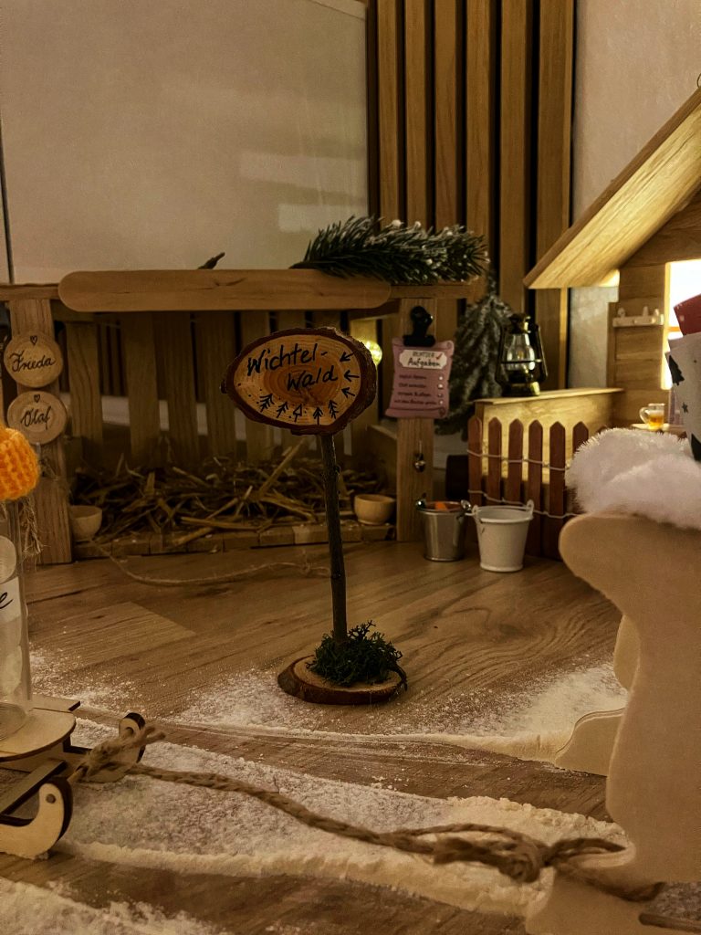 Pünktlich zum Monatsanfang hat Snorre einen schönen Adventskalender mitgebracht – die 24 Säckchen sind wieder gefüllt mit kleinen Leckereien und Überraschungen. Interessanter war aber für die Kinder die Wichtelpost und alles Neue rund um unsere kleine magische Wichtelwelt. Neben seinem Haus steht jetzt ein Stall, sorgfältig gebaut, hell erleuchtet und gemütlich ausgelegt mit wärmendem Stroh. Ansonsten ist es noch ruhig rund um das Haus, aber es sieht so aus, als würde bald Gesellschaft einziehen.