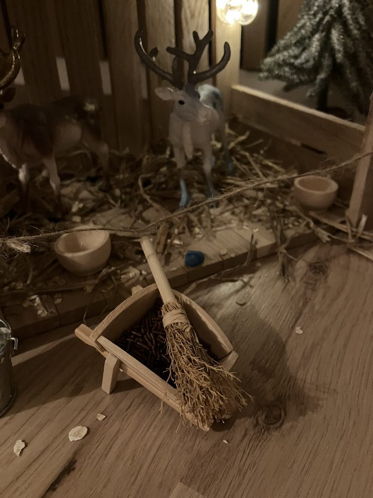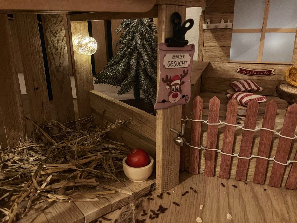 In der Futterschale lag ein roter Apfel – vielleicht ihr Nikolausgeschenk? Und direkt neben Snorres Tür steckten seine Stiefel, frisch geputzt, mit einem kleinen Lebkuchenmann darin und etwas Grün, das aus dem Stiefel hervorlugte.