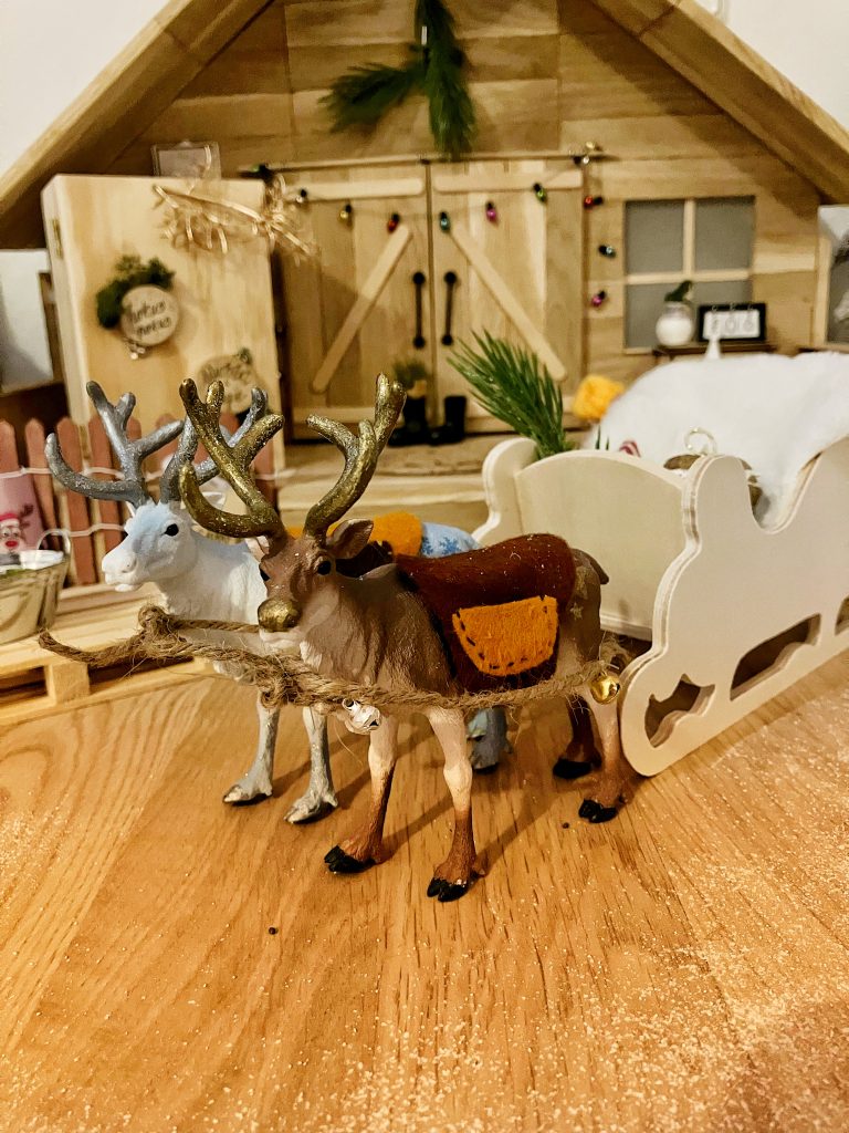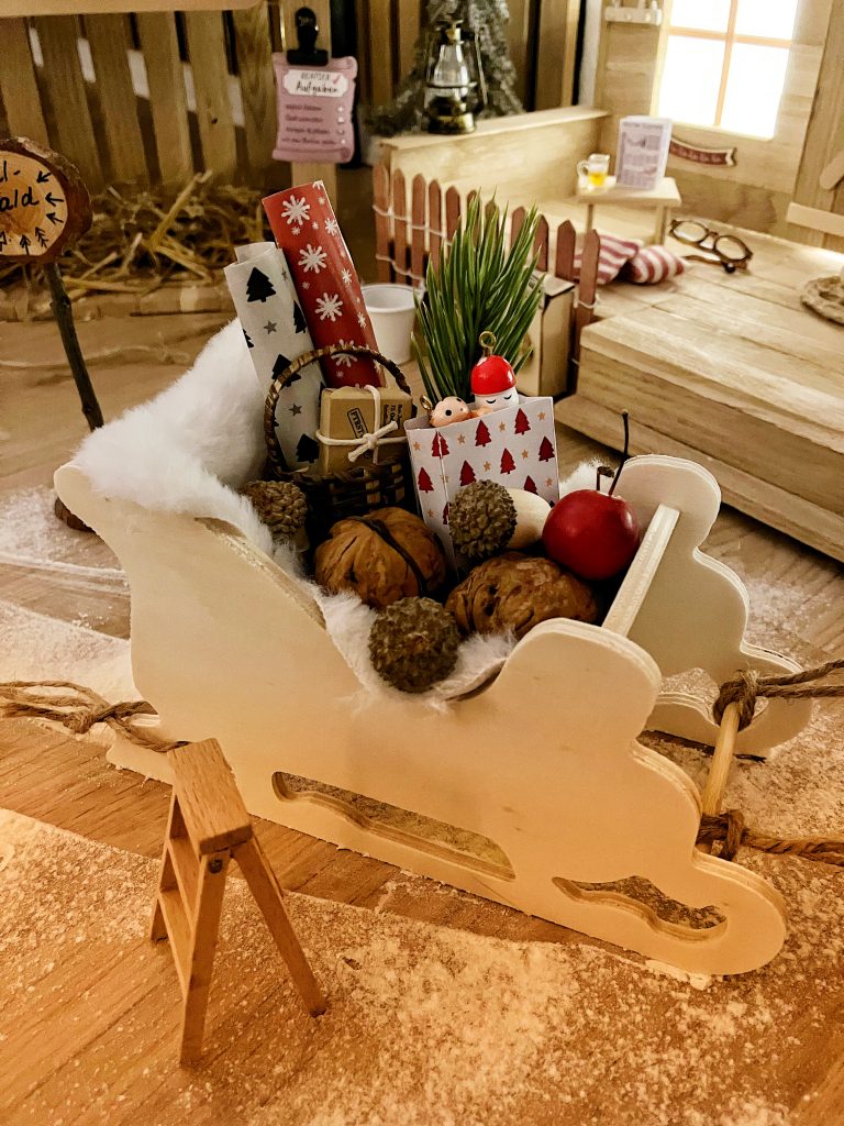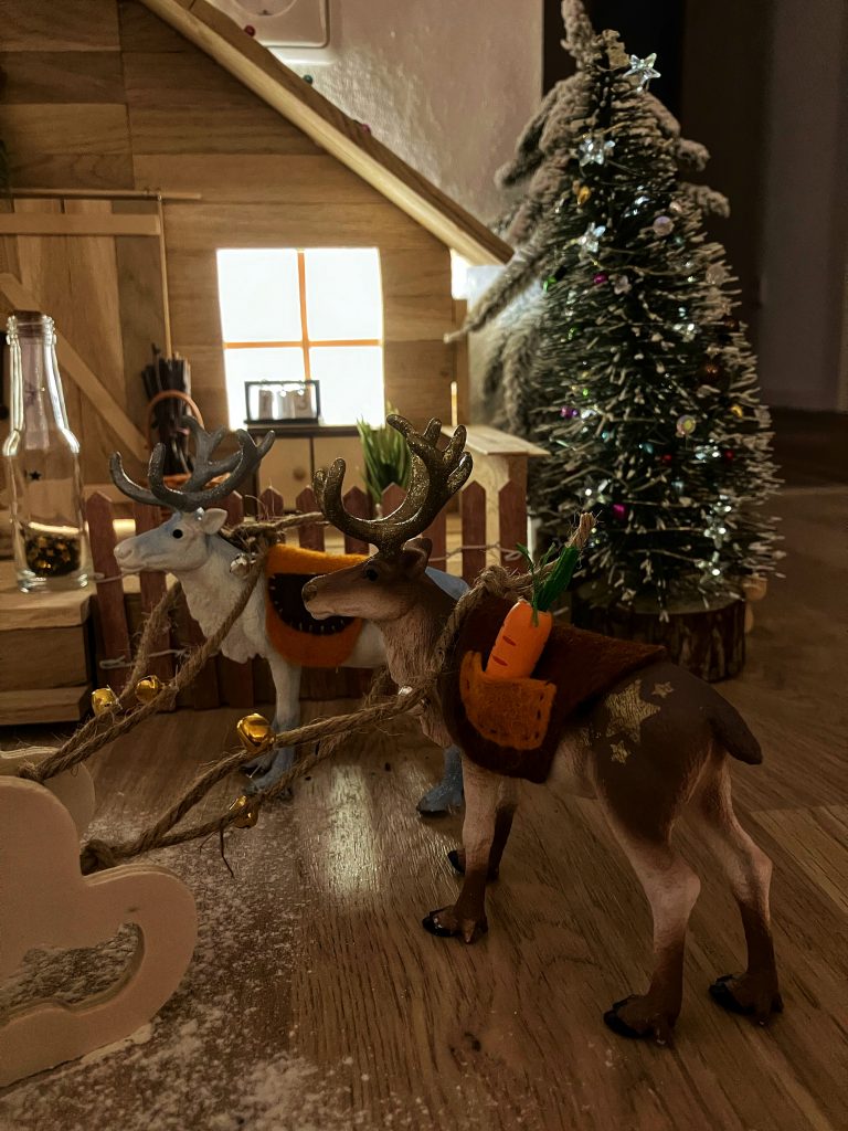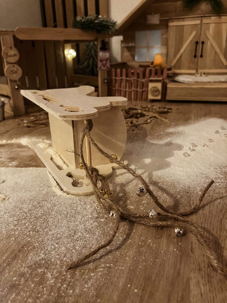 Vor Snorres Haus stand der kleine Schlitten, weich ausgepolstert mit weißem Fell, geschmückt mit einem Tannenzweig und einem gemütlichen Kissen. Darin lag eine goldene Nuss, fein verschnürt mit einer Schleife und einem kleinen Zettel: „Für … & …“. Die Rentiere Olaf und Frieda standen schon bereit, das Geschirr angelegt, als wollten sie gleich losfliegen.