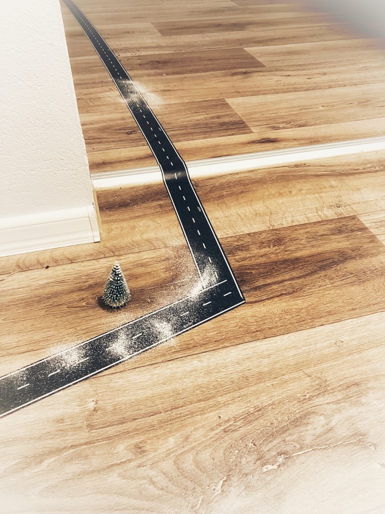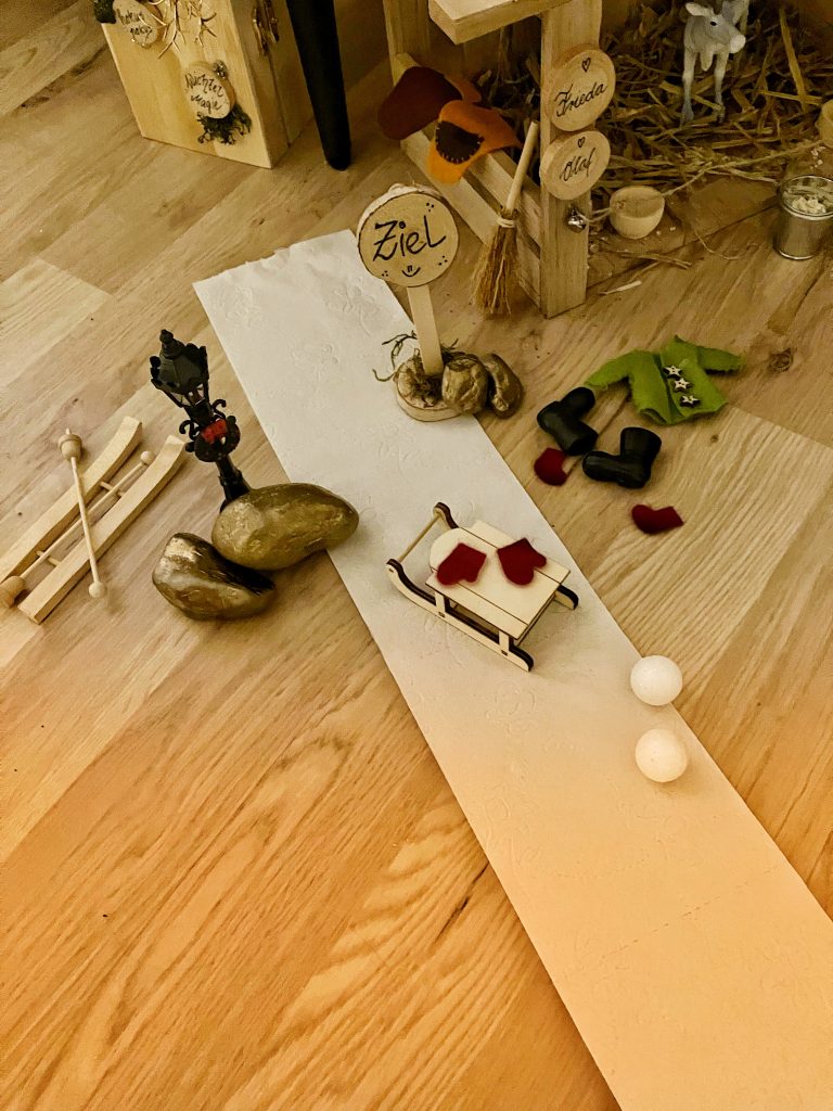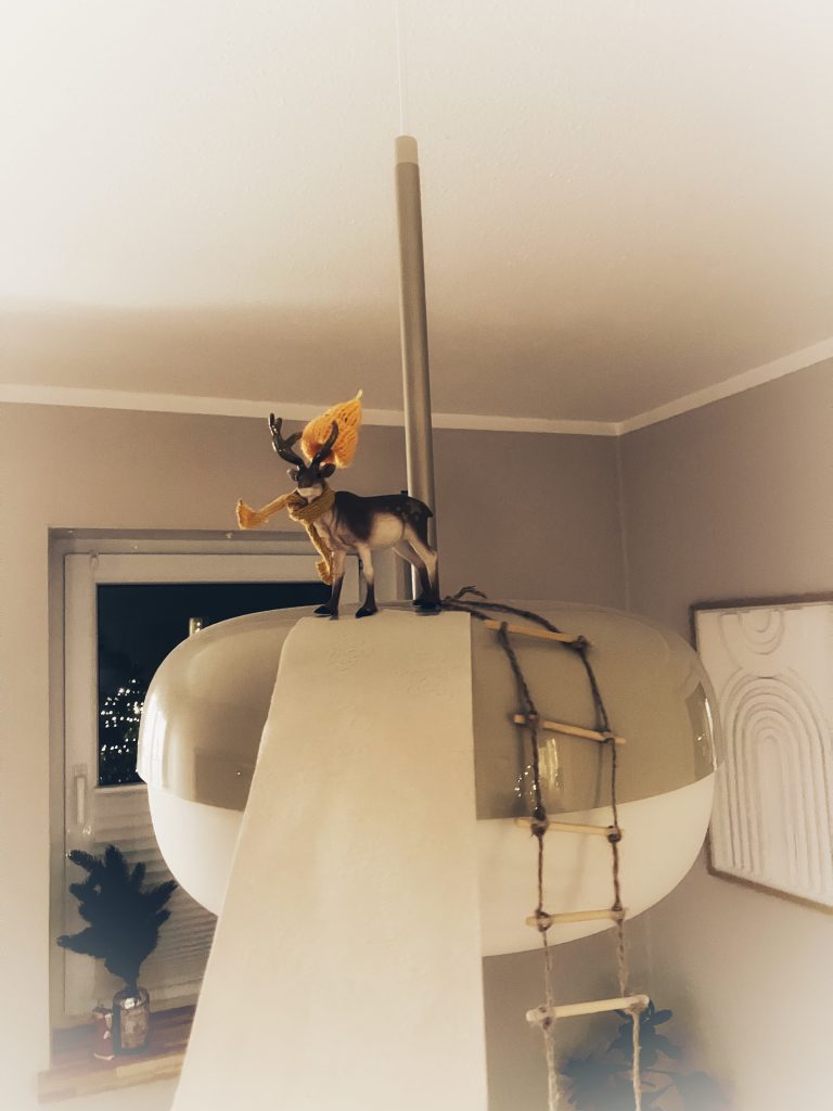 Oh je, was war da denn los? Offenbar haben alle am Vortag etwas zu viel Zucker genascht – und das hatte Folgen! In der Nacht hat sie wohl die Abenteuerlust gepackt, und sie haben kurzerhand eine eigene Schlittenbahn gebaut – mitten durchs Wohnzimmer! Eine lange Bahn aus Papier schlängelt sich vom Lampenschirm bis runter zu seinem kleinen Wichtelhaus. Ganz oben steht Olaf bereit, mit flatterndem Schal und entschlossenem Blick.