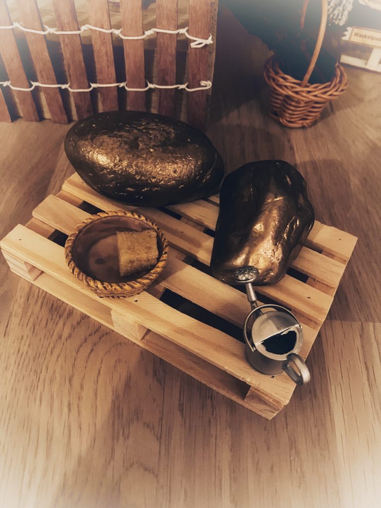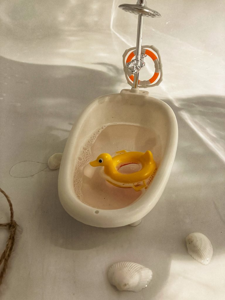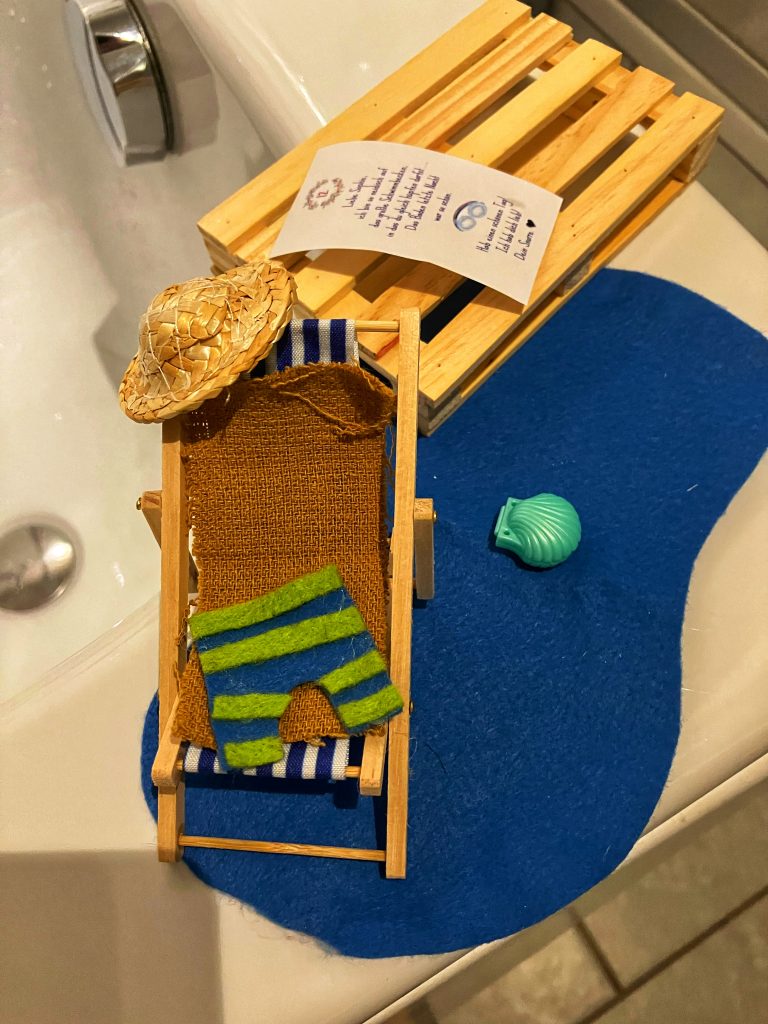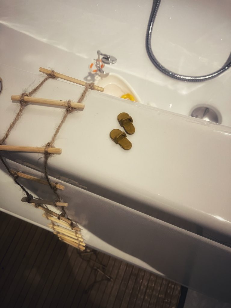 Im Badezimmer hat er sich seinen ganz eigenen Wichtel-Spa-Bereich eingerichtet – mit Mini-Badewanne, Muscheln, Entchen und einer Hängeseilleiter zum sicheren Einstieg. Auf dem weichen blauen Teppich liegt sein Handtuch bereit, daneben Strohhut und eine gestreifte Badehose. Auf der kleinen Holzliege lässt er sich’s gutgehen – schließlich muss auch ein Wichtel mal entspannen.