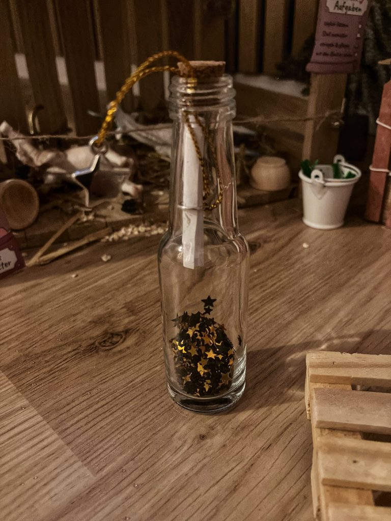 ♥ Die Lampe im Stall habe ich einfach aus einer kleinen Miniatur Glasflasche* gebastelt. In das Glas wurde einfach eine kleine Mikro-Lichterkette (10 LED) reingesteckt und das Batteriefach an die Rückseite des Stalls geklebt. Heißleim genügt, um die Lampe stabil an der Stallwand zu befestigen.
