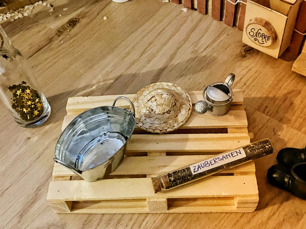 Auf der Palette standen eine Gießkanne zum gießen, ein Hut und ein Glas mit Zaubersamen. Jetzt heißt es: pflanzen, gießen und abwarten. Mal sehen, was passiert.