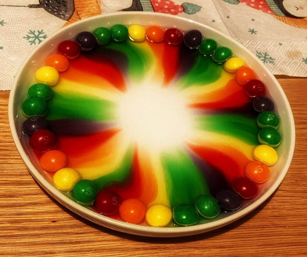 ♥ Dafür braucht ihr nur ein paar bunte Zauberperlen (Smarties, die hat Snorre natürlich bereitsgestellt) und etwas warmes Wasser. Legt die Perlen im Kreis auf einen Teller, gießt vorsichtig das Wasser dazu – und wartet.