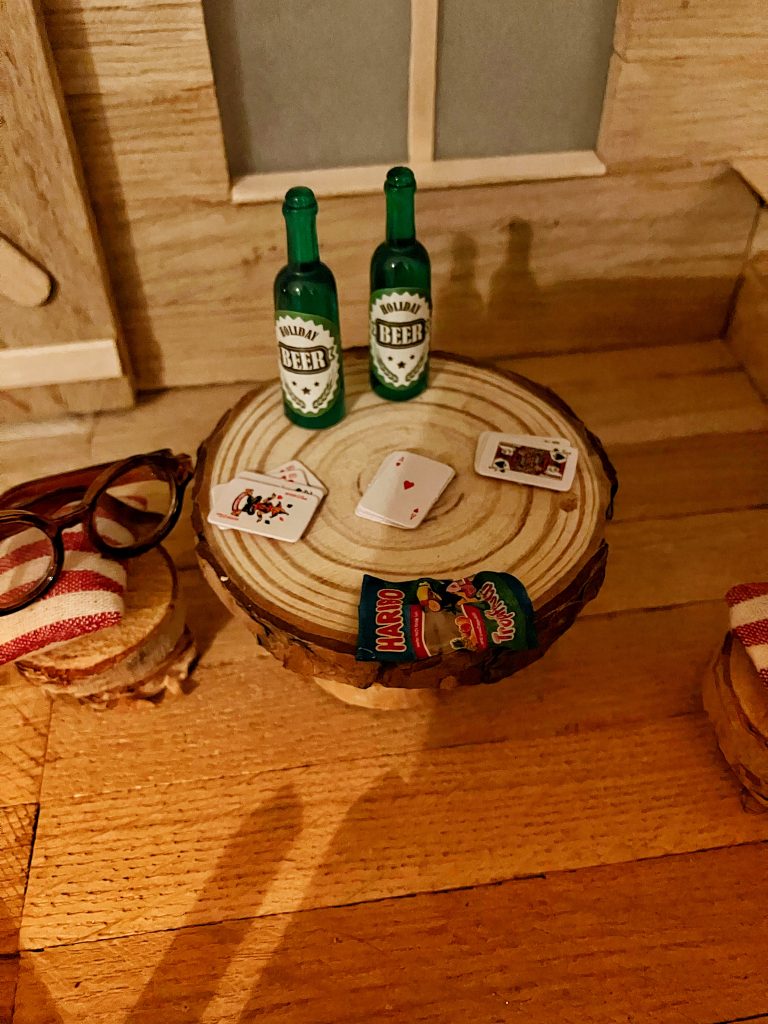 Vor der kleinen Holztür lag das Spielfeld, ein paar Holzfiguren waren schon umgefallen – offenbar ging es ziemlich lebhaft zu. Auf dem Tisch standen kleine Flaschen, ein Kartenspiel und sogar eine Tüte Gummibärchen.