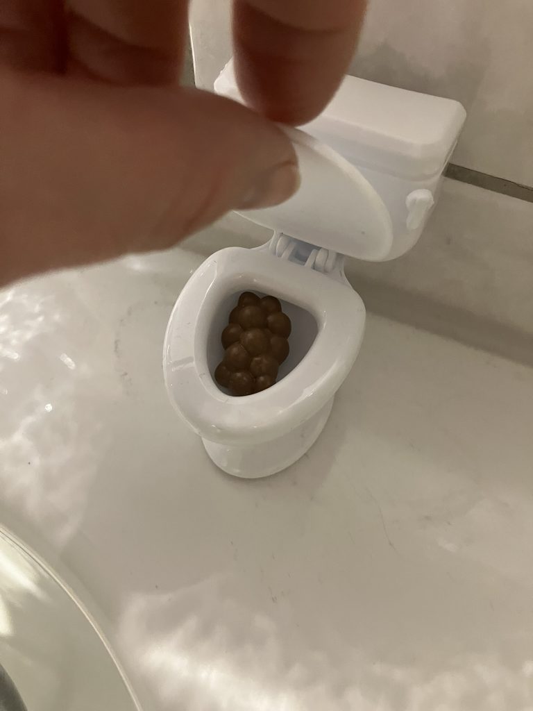 Doch wie immer bei Snorre bleibt’s nicht ganz ohne Schabernack: Im Wichtel-Klo hat er eine kleine Überraschung hinterlassen – Schokokügelchen!