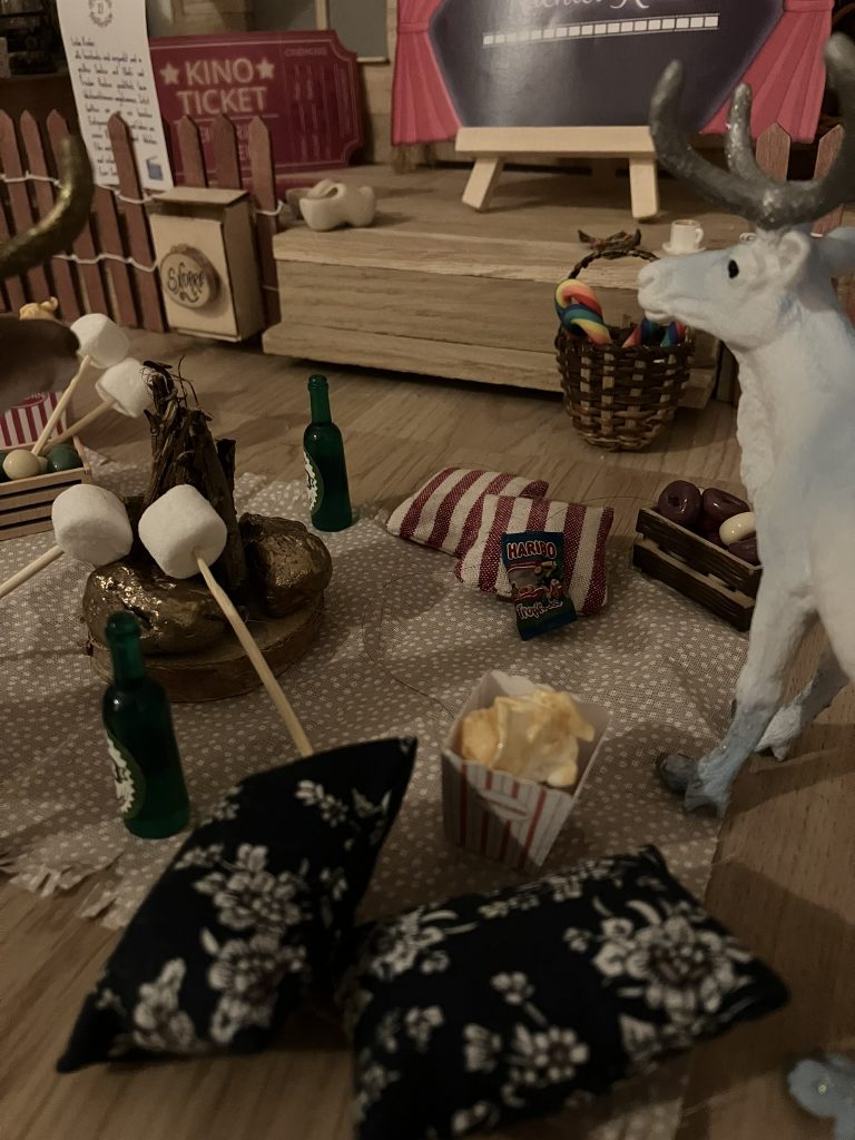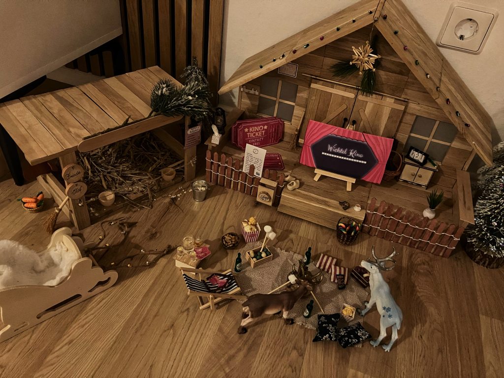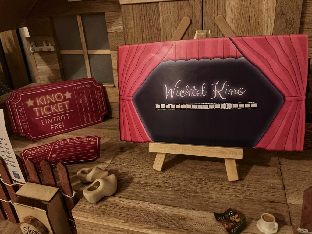 Vor dem kleinen Wichtelhaus ist alles vorbereitet für einen gemütlichen Kinoabend unterm Sternenhimmel. Eine kleine Leinwand steht bereit, auf der in goldenen Buchstaben „Wichtelkino“ geschrieben steht – der Eintritt ist, wie es sich für gute Freunde gehört, natürlich frei.