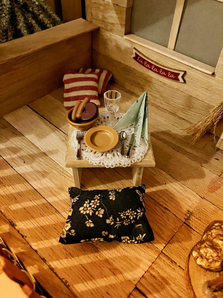 Im kleinen Wichtelhaus ist alles festlich geschmückt – an der Tür hängt ein Kranz, der Kamin glüht und auf dem Tisch steht ein liebevoll gedecktes Weihnachtsessen mit winzigen Tellern, Würstchen und sogar einem gefalteten Serviettentuch. Snorre hat es sich richtig gemütlich gemacht.
